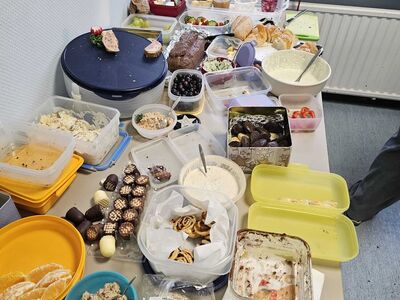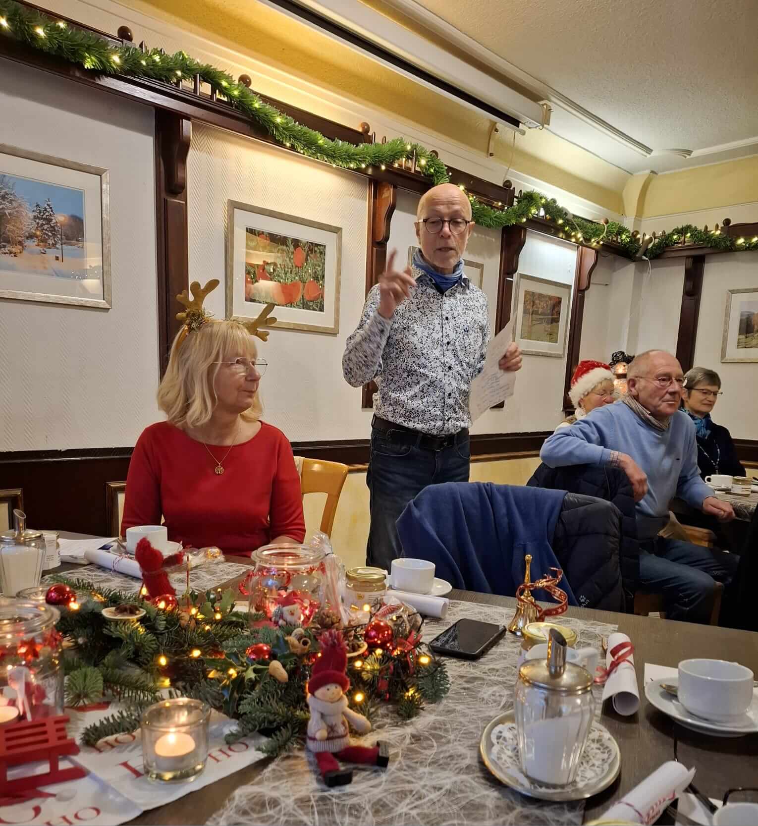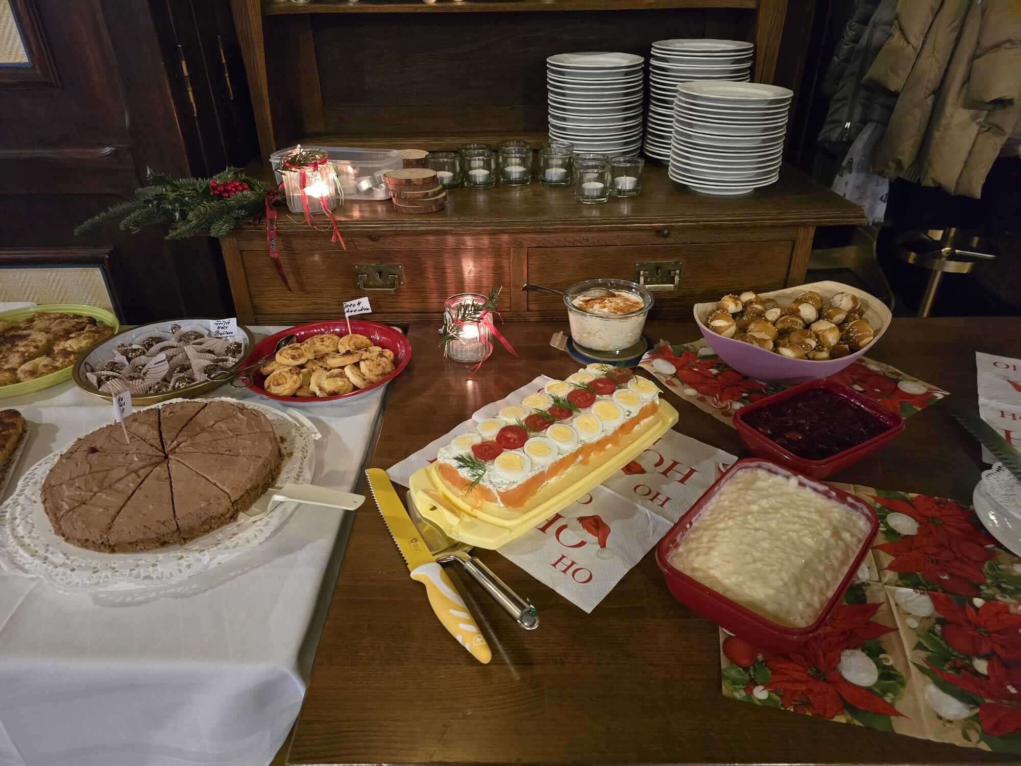 Die mitgebrachten Kuchen und herzhaften Speisen wurden liebevoll auf dem Buffet angerichtet. Zahlreiche Köstlichkeiten wie Kuchen, Plätzchen, Milchreis, eine Lachsbrottorte, Zwiebelkuchen, Pizzastücke und Spinatschnecken und vieles mehr, machten unser Weihnachtsbuffet zu etwas ganz Besonderem. Schnell nahmen alle Gäste ihre Plätze ein. Die Freude über das Wiedersehen war deutlich spürbar – auch am lebhaften Geräuschpegel. Schließlich erklang das Weihnachtsglöckchen, und unser 1. Vorsitzender Lothar begrüßte die Anwesenden mit einer kurzen Ansprache. Auch Beate ließ es sich nicht nehmen, sich bei allen Mitgliedern für die vielen helfenden Hände sowie die mitgebrachten Leckereien zu bedanken. Ihr Fazit: Wir sind eine tolle Gemeinschaft – ein toller Verein! Anschließend eröffnete Steffi, unsere 2. Vorsitzende, das heiß ersehnte Buffet.