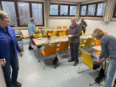 Seit etlichen Jahren treffen sich unsere Mitglieder an Silvester zur Kurzwanderung mit Ziel Jugendherberge Lindlar. Dort haben fleißige Hände und Helferlein schon Tische und Stühle zurechtgestellt, Teller, Tassen und Besteck aufgelegt und danach den ersten Kaffee getrunken. Doch wie viele Tische brauchen wir? Wie viele Stühle? Wohin mit dem SGV-Buffet? Fragen über Fragen.