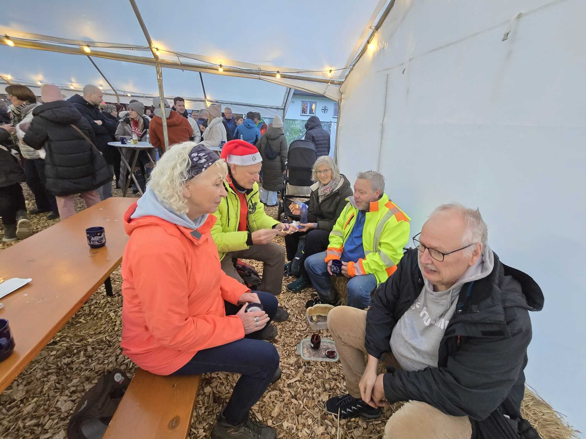 Über Frikadellen, Würstchen, Plätzchen, Stollen und Käse war alles vertreten, was die Nähte der Kleidung nach dem Essen halten mussten. Also am besten gleich wieder abtrainieren. Tische zurückstellen, Stühle zählen und wieder dorthin bringen, wo wir sie hergeholt haben. Besen schnappen und den Raum besenrein an die Herberge übergeben. Alle haben angepackt, und so war der Vorgang binnen kürzester Zeit erledigt. Ich liebe es, wenn ein Plan gelingt, Norbert.