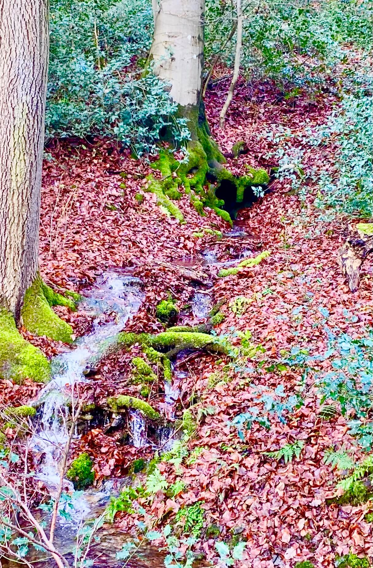 Durch den Wald geht es hinunter nach Kürten-Delling. Über Delling und Olpermühle gehen wir am Olpebach entlang nach Kohlgrube. An der Hermannsquelle bietet sich eine Picknick-Pause an, wir genießen die mitgebrachten Leckereien.