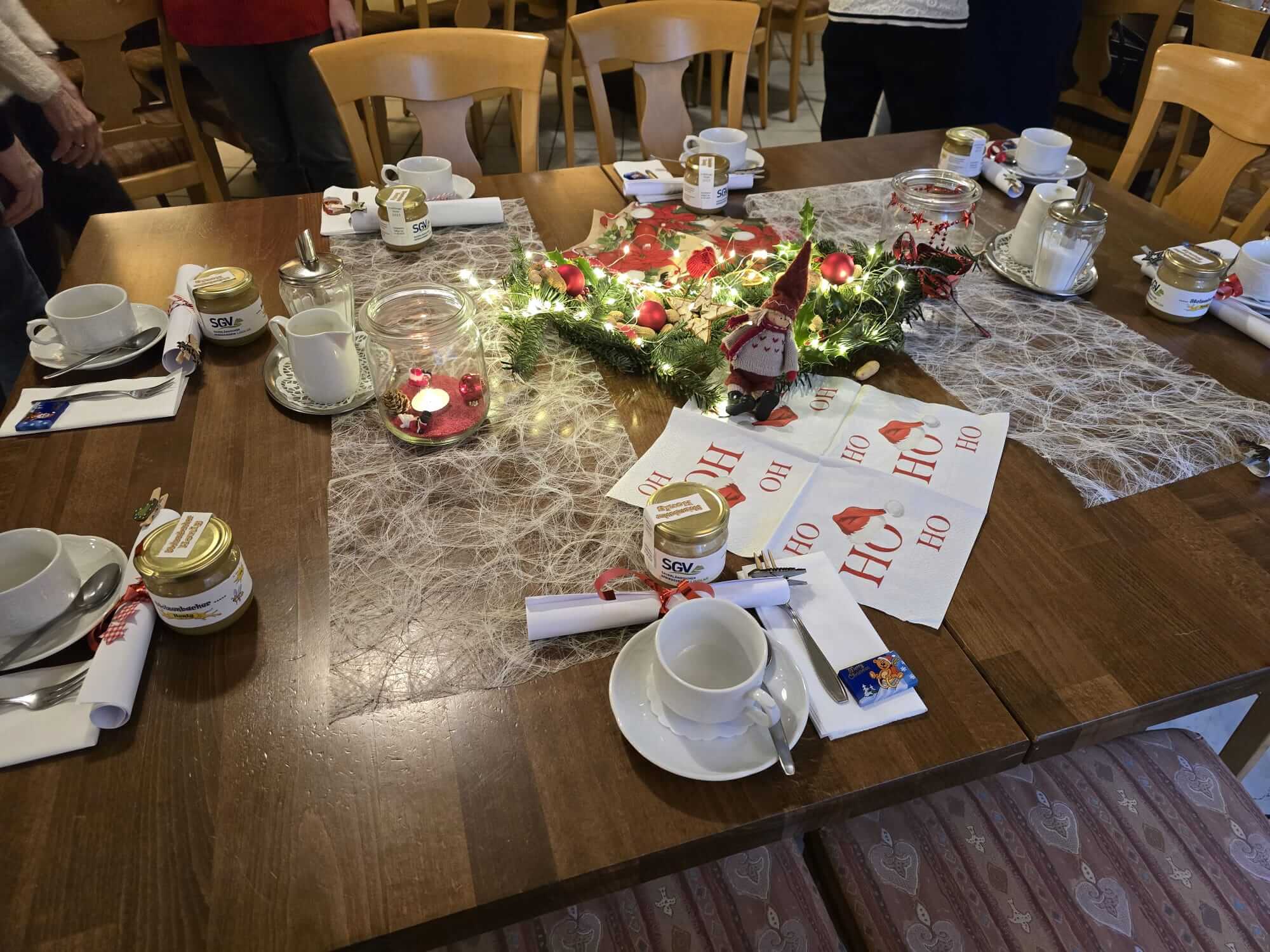 Bereits kurz nach 14.00 Uhr trafen sich Wolfgang und Erika gemeinsam mit Beate, um die Tische liebevoll zu dekorieren. Die am Vortag bei Beate gebastelten Tannenzweige – geschmückt mit Ilex und Schleifen von unseren Schmitzhöher Perlen (Marita, Gertrud E. und Brigitte) – fanden schnell ihren Platz auf den Tischen. Kleine LED-Lichterketten und hübsche Accessoires von Erika zauberten eine stimmungsvolle, adventliche Atmosphäre. Vom SGV gespendete Honiggläser, Einladungen zur Jahreshauptversammlung 2026 sowie kleine Schokotäfelchen rundeten die Tischdekoration ab. Für den Honig bedanken wir uns nochmals ganz herzlich bei unserem Wegewart Florian Schöllnhamer. (Imkerei Schöllnhamer, Lindlar). Gegen 14.30 Uhr trafen weitere fleißige Helferinnen ein. Marita ergänzte die Dekoration mit ihren wunderschön gestalteten Gläsern, gefüllt mit Teelichtern, Herzen, Sand und kleinen Figuren. Nach und nach kamen immer mehr Mitglieder hinzu und halfen beim Dekorieren mit. Bald entstand ein fröhliches Treiben rund um Tische und Buffet.