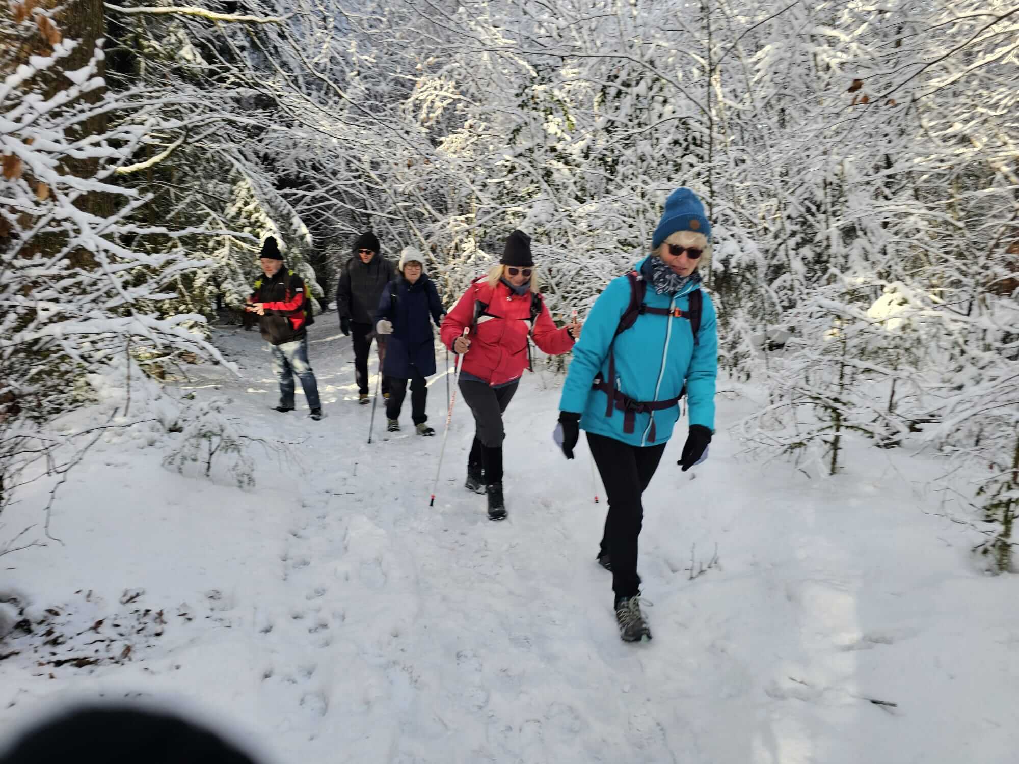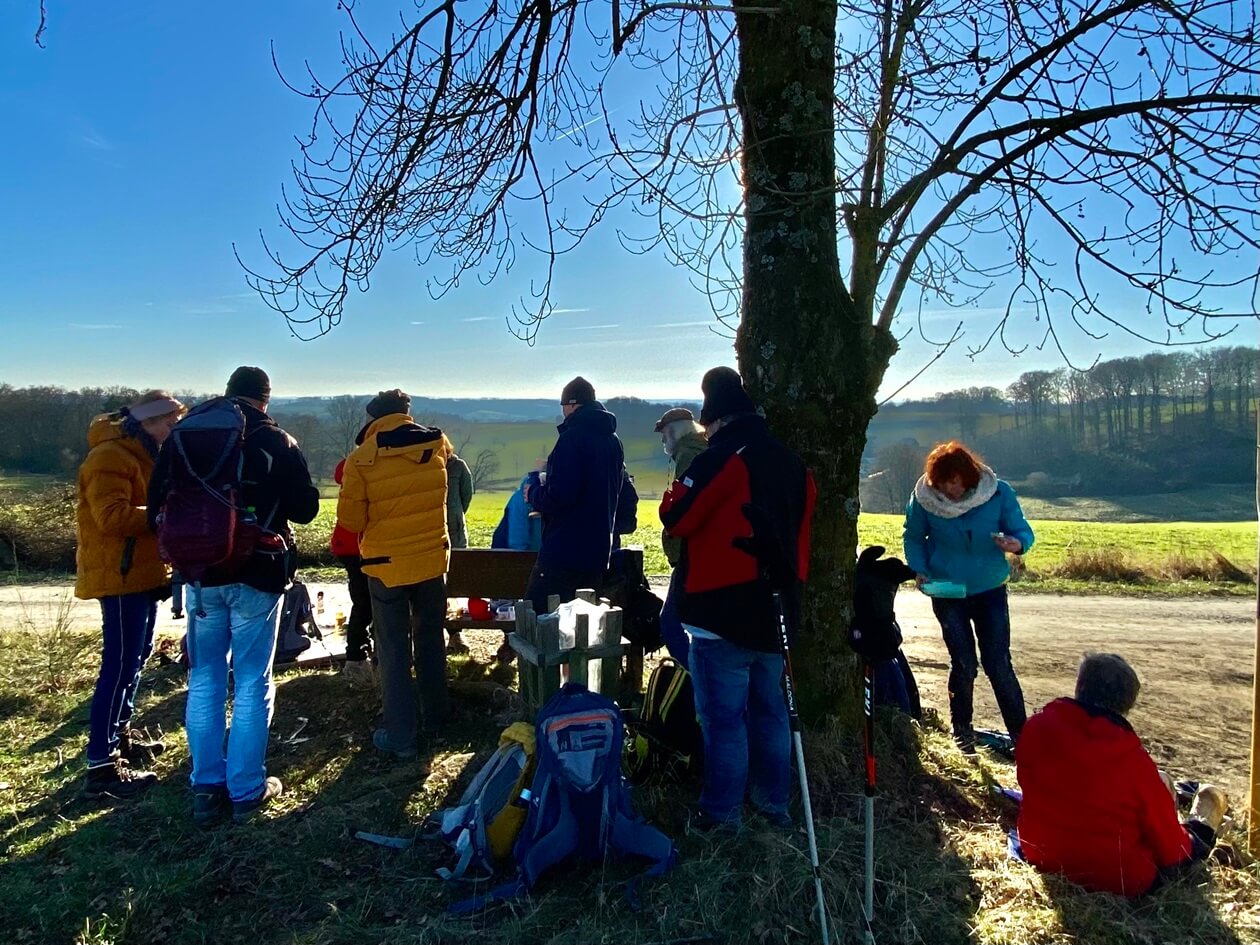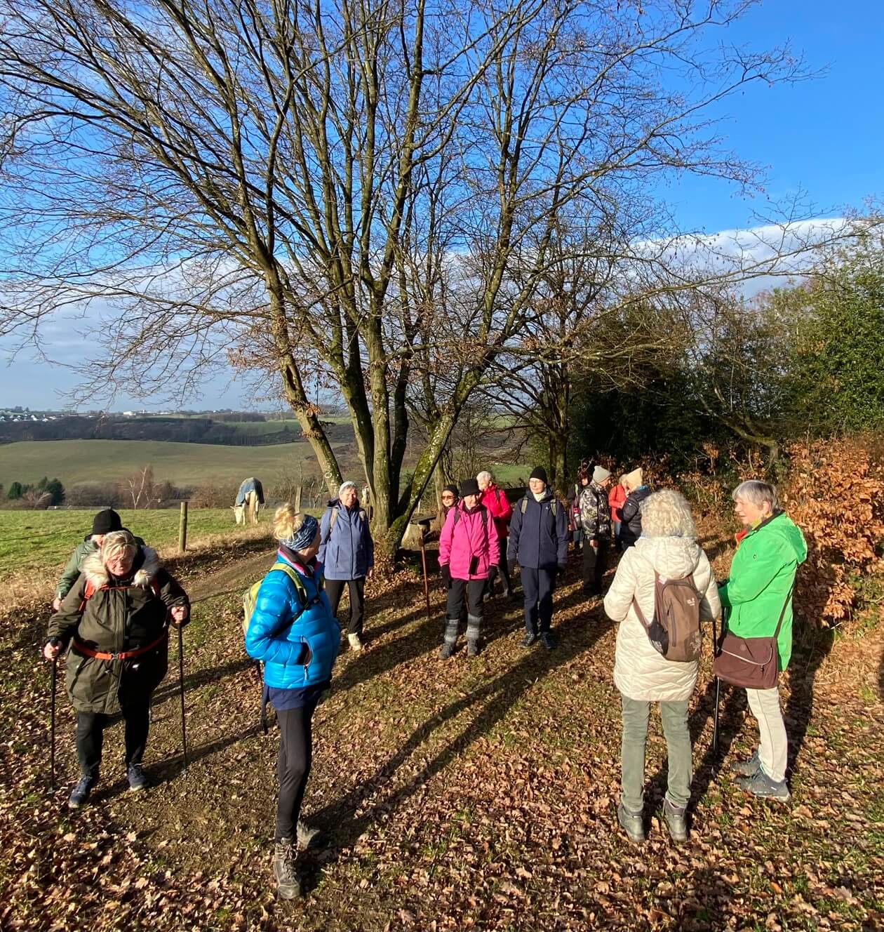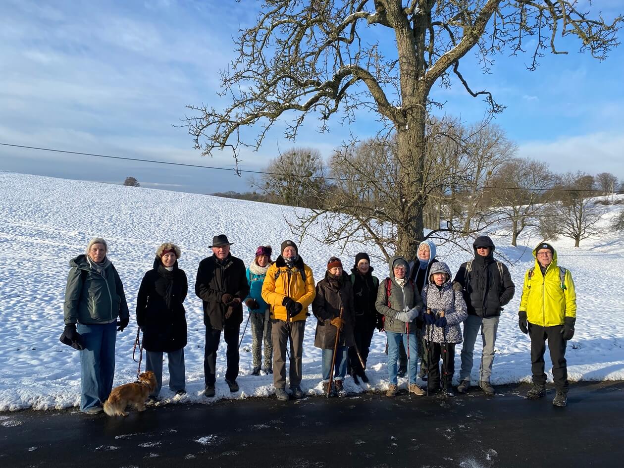 Ab sofort Tradition? Ganz ohne Weihnachts-Blues folgten 15 gut eingemummelte Wander*innen der Einladung zur Wanderung am 2. Weihnachtsfeiertag. Frostige Temperaturen, ein blitzblauer Himmel mit strahlender, wenn auch tief stehender Sonne bildeten den perfekten Rahmen für unsere genußvolle Winter-Wanderung.
