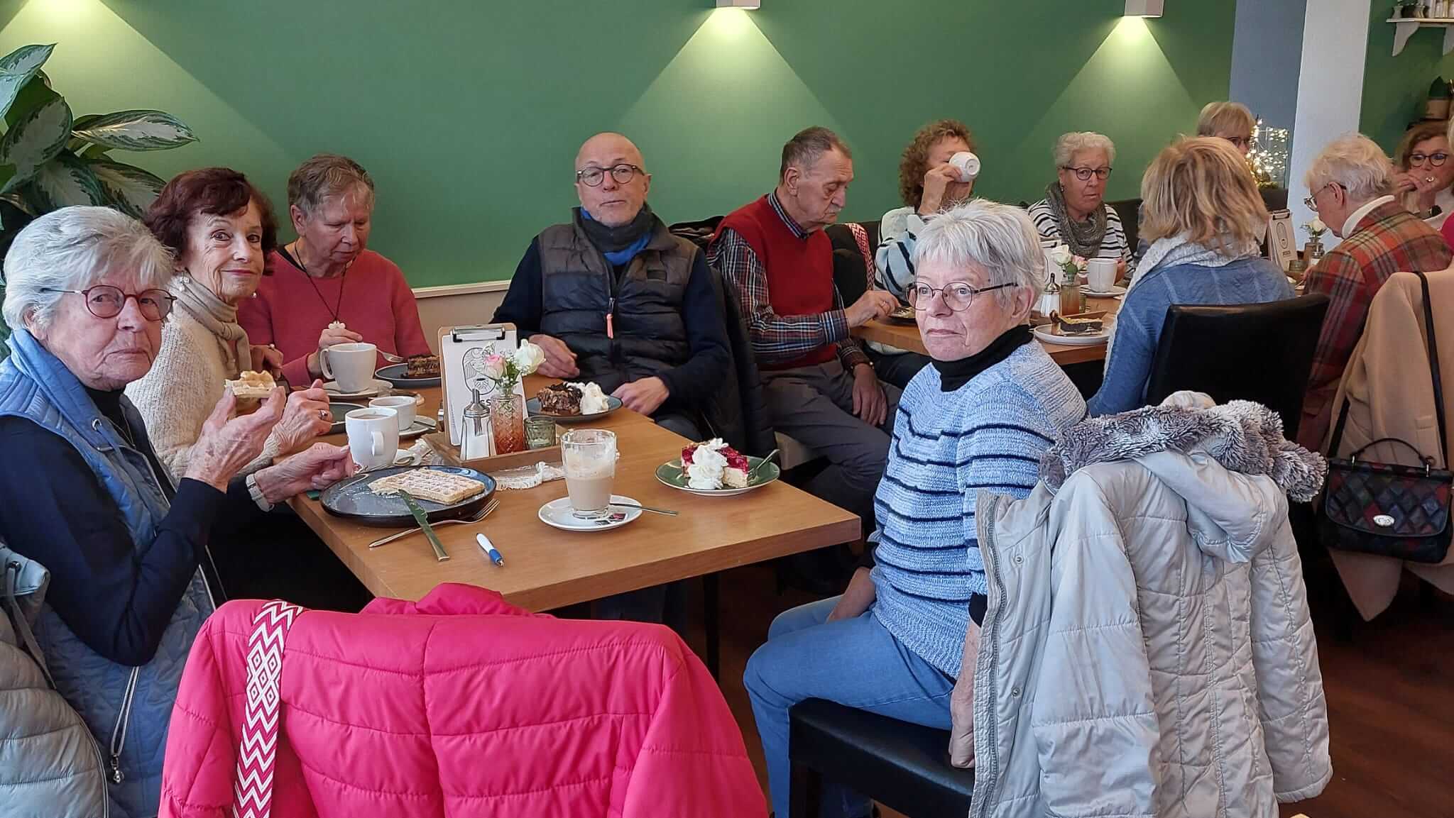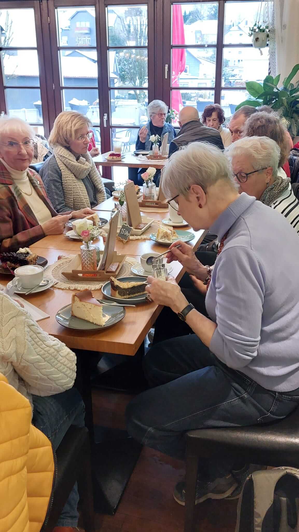 Mittlerweile lachte uns auch wieder die Sonne, und zum Abschluss wollten wir nur noch einen kurzen Blick ins kleine Café werfen; „ nur kurz“! Aber die Torten erwiesen sich als zu verlockend und jeder kleinen Sünde wert… Die 11,2Km dieses schönen Tages gingen auch den Senioren leicht vom Fuß, satt und zufrieden sagen wir unserer Ingrid dafür danke! Lothar