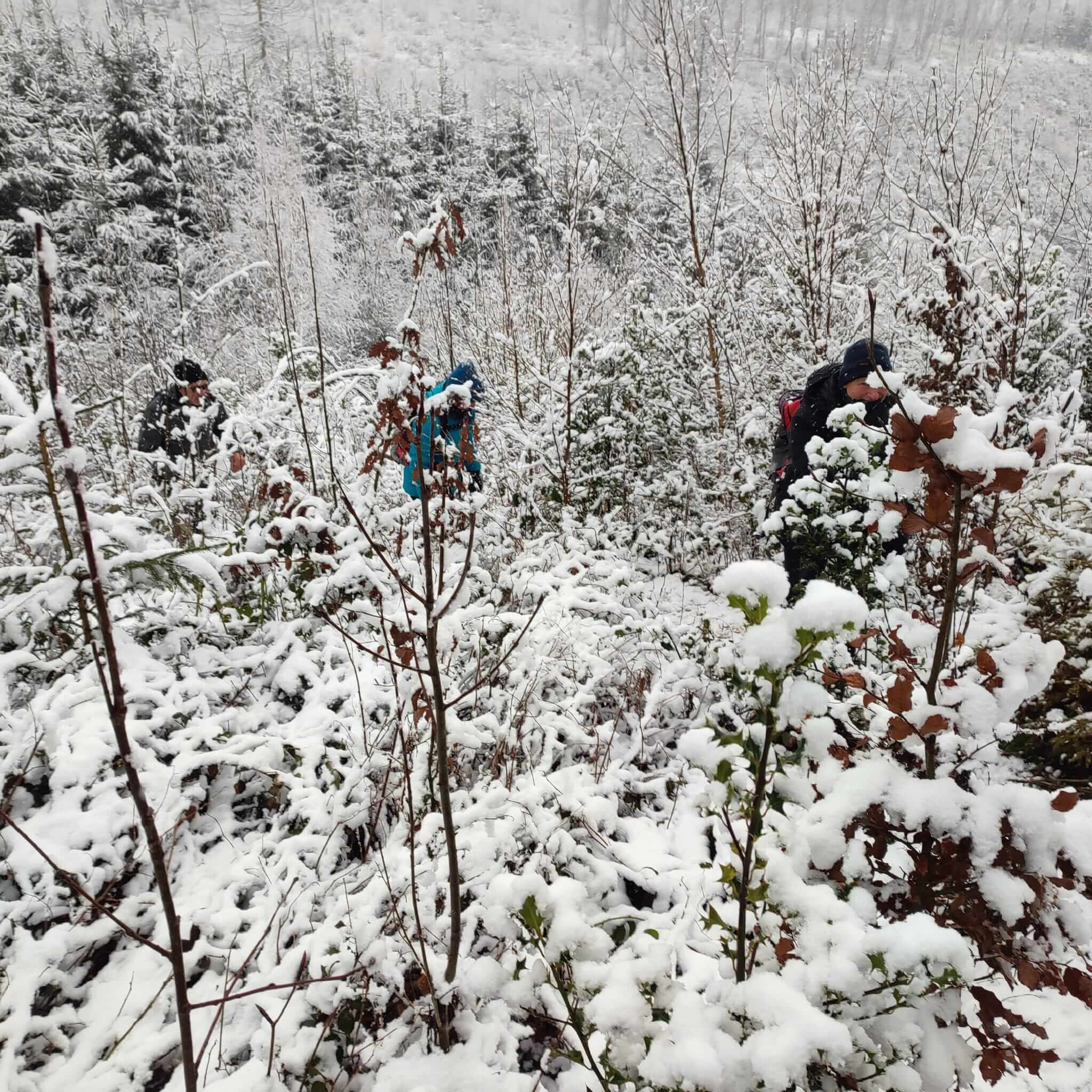 Es ging weiter in Richtung Metabolon. Leichter Schneefall setzte ein und im Nu war der Weg wieder verschneit. Die Schutzhütte am Metabolon bot uns Schutz für unser Buffet.