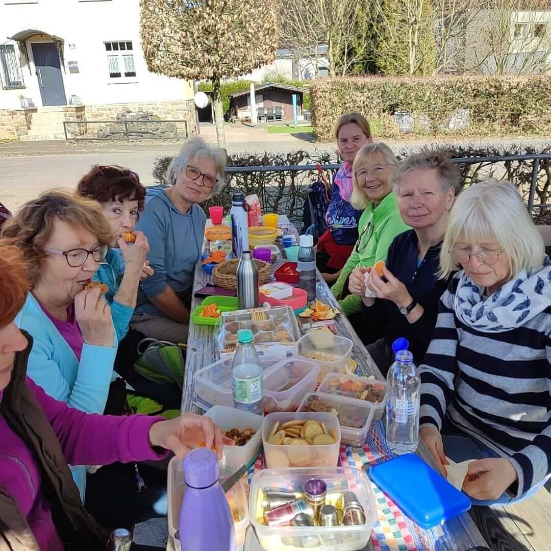 Das nächste Ziel war Osberghausen. Das herrliche Wetter hat viele dazu bewogen an der Wanderung teilzunehmen. Es war aber auch ein besonders schöner Weg. In Osberghausen ging es auf schmalen Pfaden hinüber nach Oesinghausen, wo ein schönes Platz für unser Buffet wartete. Die ersten Anstiege lagen hinter uns und machten uns hungrig.