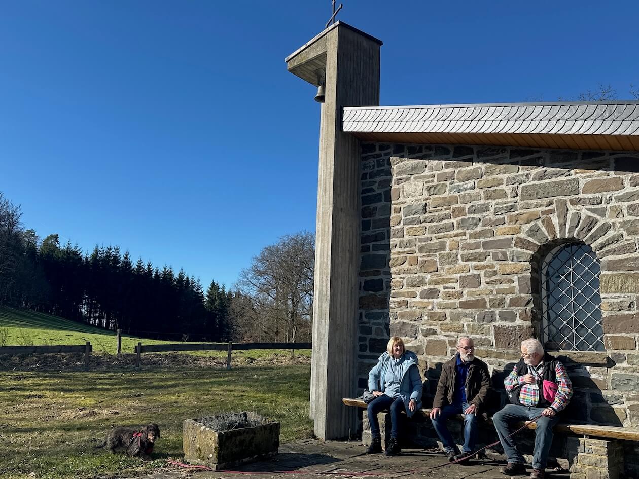 In Winkel kam es dann vermutlich zur ersten Pause überhaupt bei einer derartigen Kurzwanderung von nur vier Kilometern – an der Hubertuskapelle. Aber warum auch nicht? Sitzen und tratschen in der Sonne, dazu den Maracujalimoncello von Lothar genießen und ein Stück Schokolade von Lindt – man was geht es uns gut. Solche Momente kann man nicht planen, aber man darf sie auskosten.
